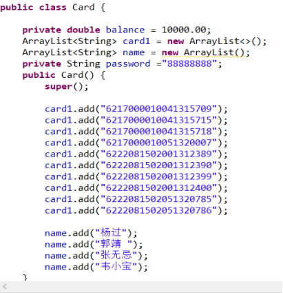 题目集08需要先将基础数据初始化,刚开始我是将数据在card类中进行初始化的,在card类中创建列表,将卡号添加到列表里面,