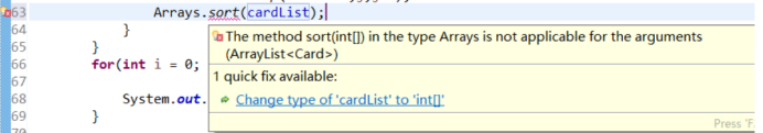 3.在题目集07的7-1中本来是想用Arrays里的sort()排序的,但是会报错,类型数组中的方法sort(int[])不适用于参数(ArrayList<Card>),就使用了Collections类的swap()方法,进行排序了;