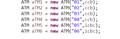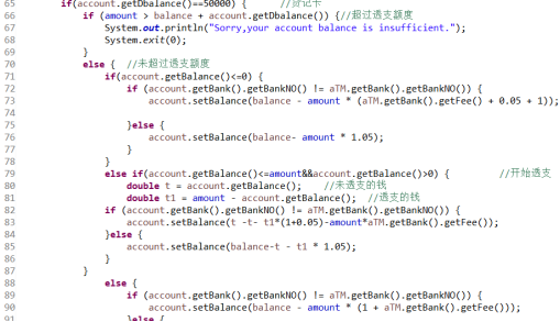 题目集09则是在题目集08的基础上,增加了几个账户,增加了借记卡(可以透支),还增加了手续费;老师也把题目集08的参考代码发出来了,只需要在题目集08的代码进行修改,首先先添加新的用户和ATM机和银行,在给银行里添加跨行手续费,透支手续费和透支额度,透支额度是这样设计的,如果这张卡是借记卡,则设置额度为0,如果是信用卡,则设置额度为50000;然后将输出方式改成题目要求的;