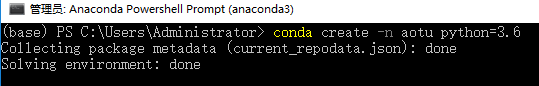 从开始菜单运行“Anaconda Prompt”,出现的界面输入创建虚拟环境的指令。成功创建了一个名字为aotu,且基于python版本3.6的虚拟环境。