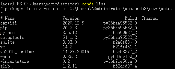 上面我们已经创建并激活了名为aotu虚拟环境,输入conda list可以查看当前虚拟环境里已经安装的库。