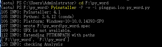2、执行命令Pyinstaller -F -w -i chengzi.ico py_word.py,执行过程特别漫长,就没有录制动图。