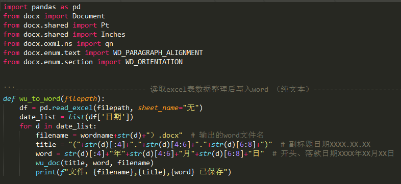 我们打开所要打包的Python脚本,对比上图,发现pandas,docx这两个库还需要额外安装。当然,也不能缺了打包必不可少的pyinstaller库。