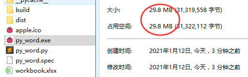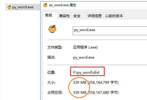 已经生成了一个名为py_word的exe应用程序,并且图标也是我们设置的橙子图案,看来已经成功一半了。
