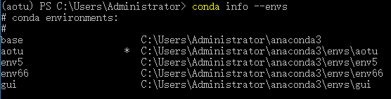 当然我们也可以在刚刚的窗口,使用命令conda info --envs,来查看conda环境下所有的虚拟环境