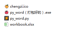 这里我们拿之前《Python自动化办公 | 同事要我帮忙补写178份Word日报!》这篇的python代码,作为案例来演示。将其中脚本py_word.py,待处理的表格文件workbook.xlsx,以及准备好的软件图标图片chengzi.ico放在了我电脑的F:\py_word目录下(如果大家感兴趣的话,可以在文末下载获取)