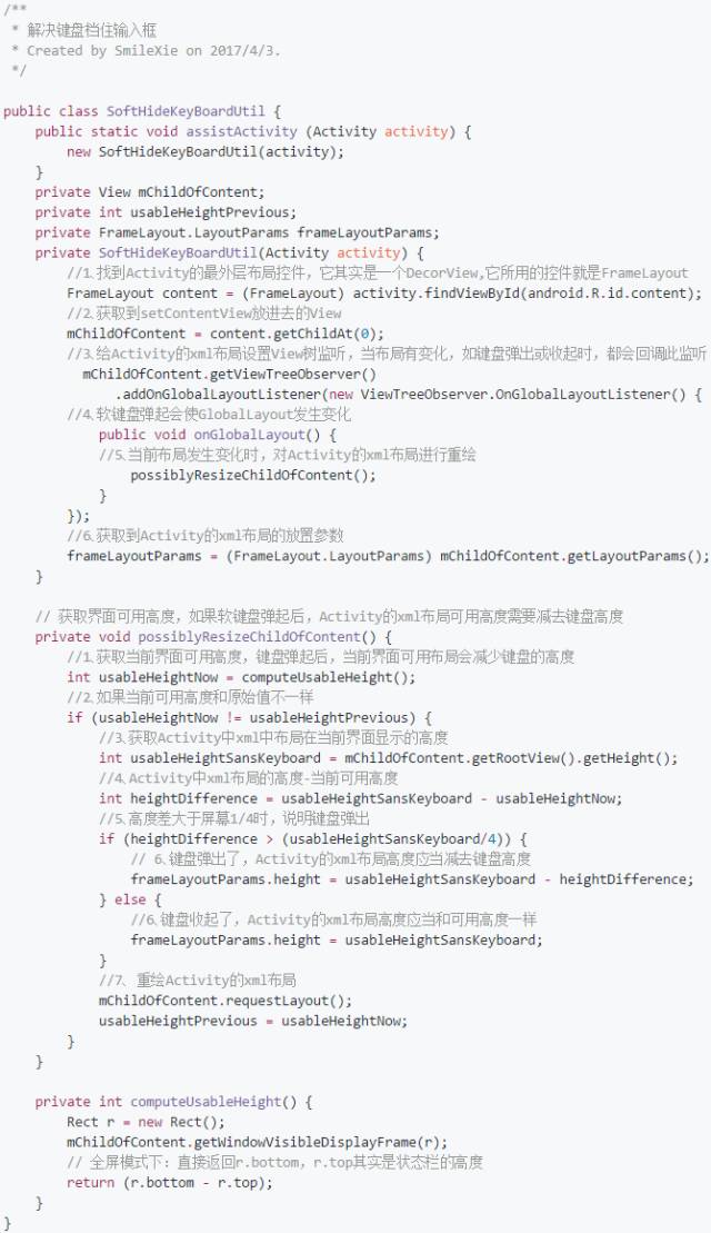 优点:可以解决全屏时,键盘挡入输入框问题。只需要写一个全局类,其他有需求的界面直接在onCreate方法里调用此类的全局方法,即可。