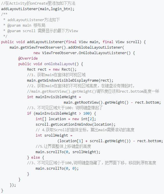 此方法通过监听 Activity 最外层布局控件来检测软键盘是否弹出,然后去手动调用控件的 scrollTo方法 达到调整布局目的。