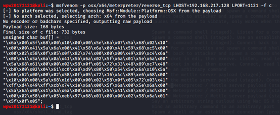 payload选择“osx/x64/meterpreter/reverse_tcp”,生成c语言格式的shellcode数组