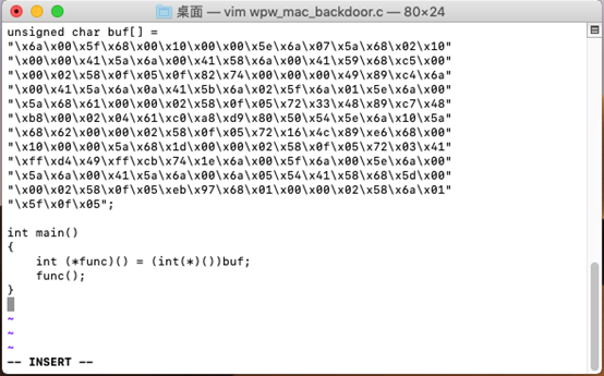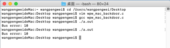 然后在mac的终端上新建.c文件wpw_mac_backdoor.c,在主函数中调用该数组,最后输入“gcc wpw_mac_backdoor.c”,使用终端编译该.c文件,生成mac下可执行文件a.out