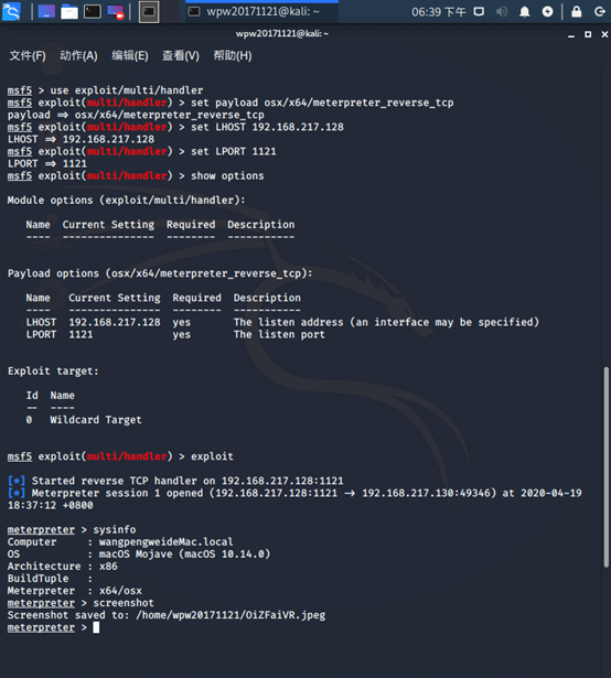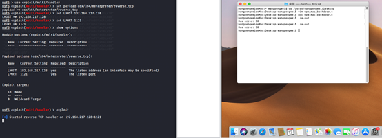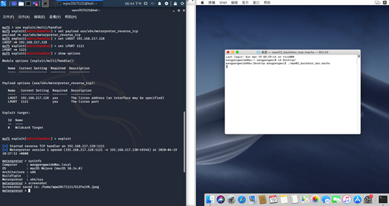 将上述生成的后门文件wpw02_backdoor_mac.macho通过共享文件夹复制到mac虚拟机上,在Linux终端进入msf控制台,设置好payload、LHOST和LPORT后,开始监听,在mac终端上输入“./wpw02_backdoor_mac.macho”,运行后门程序(下图清晰版)