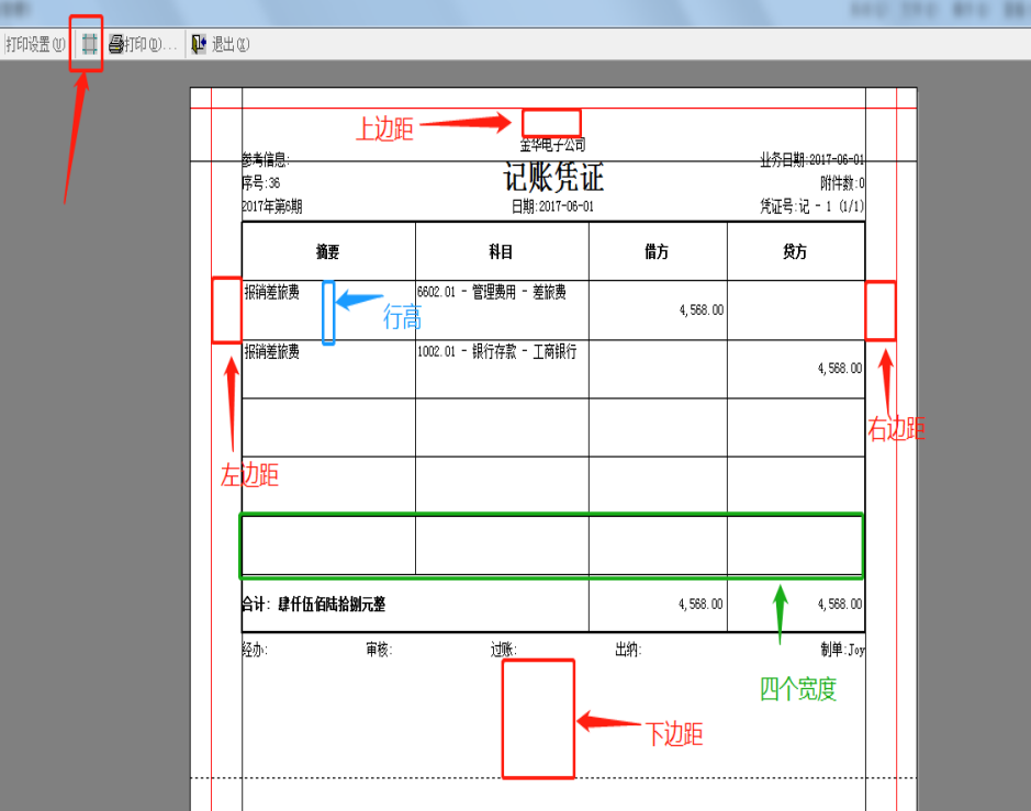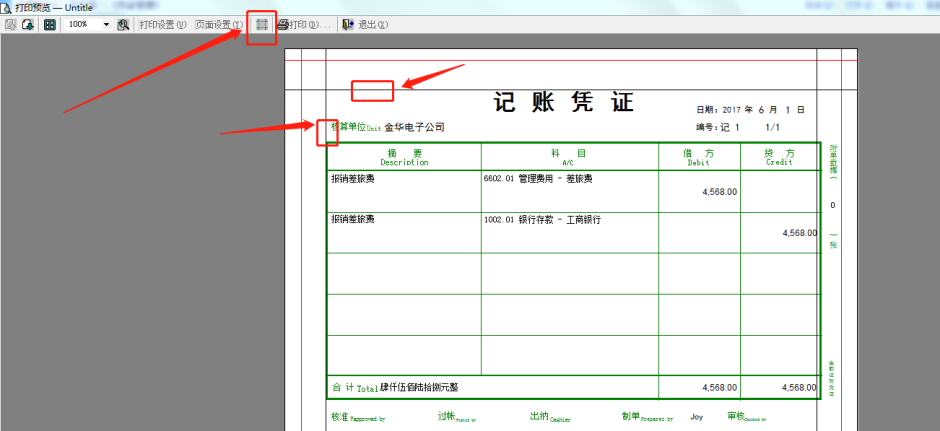 4、 测试打印及正式打印:测试打印和A4打印一样,打印一张后,可以在预览界面用两根黑线进行上下左右拖拽,直到打印出来达到理想的样子。一次性打印也和A4打印一样,先将凭证过滤出来,选择抬头的凭证,打印预览,打印,选择1到最后一张(默认),点打印即可。