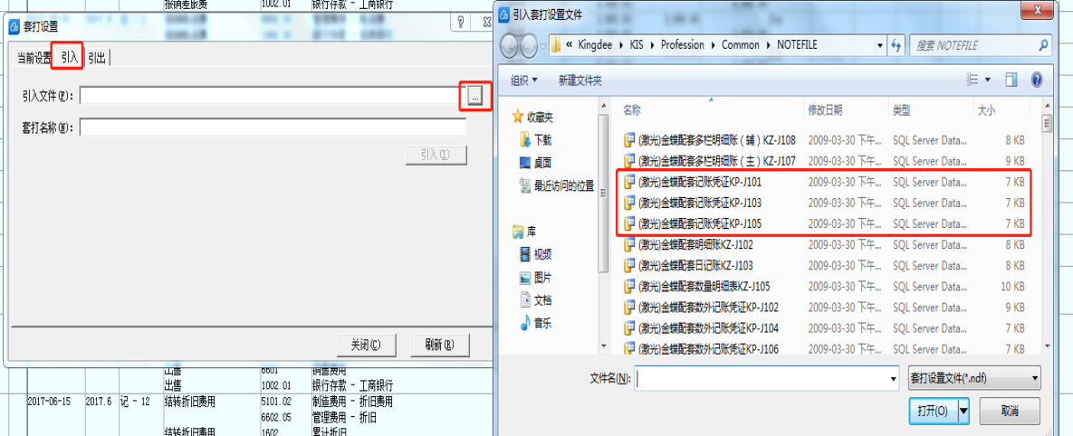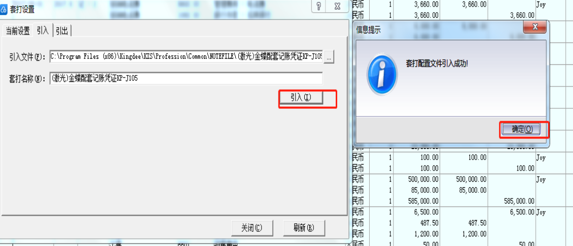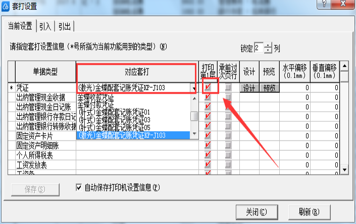 2、 打印模板设置:进入套打设置,引入相应模板,有KPJ101,103和105三个模板,空白纸任选一个,如果带格子要看凭证纸上面的型号,其他非这三个型号凭证纸别买,可能调整不了。
