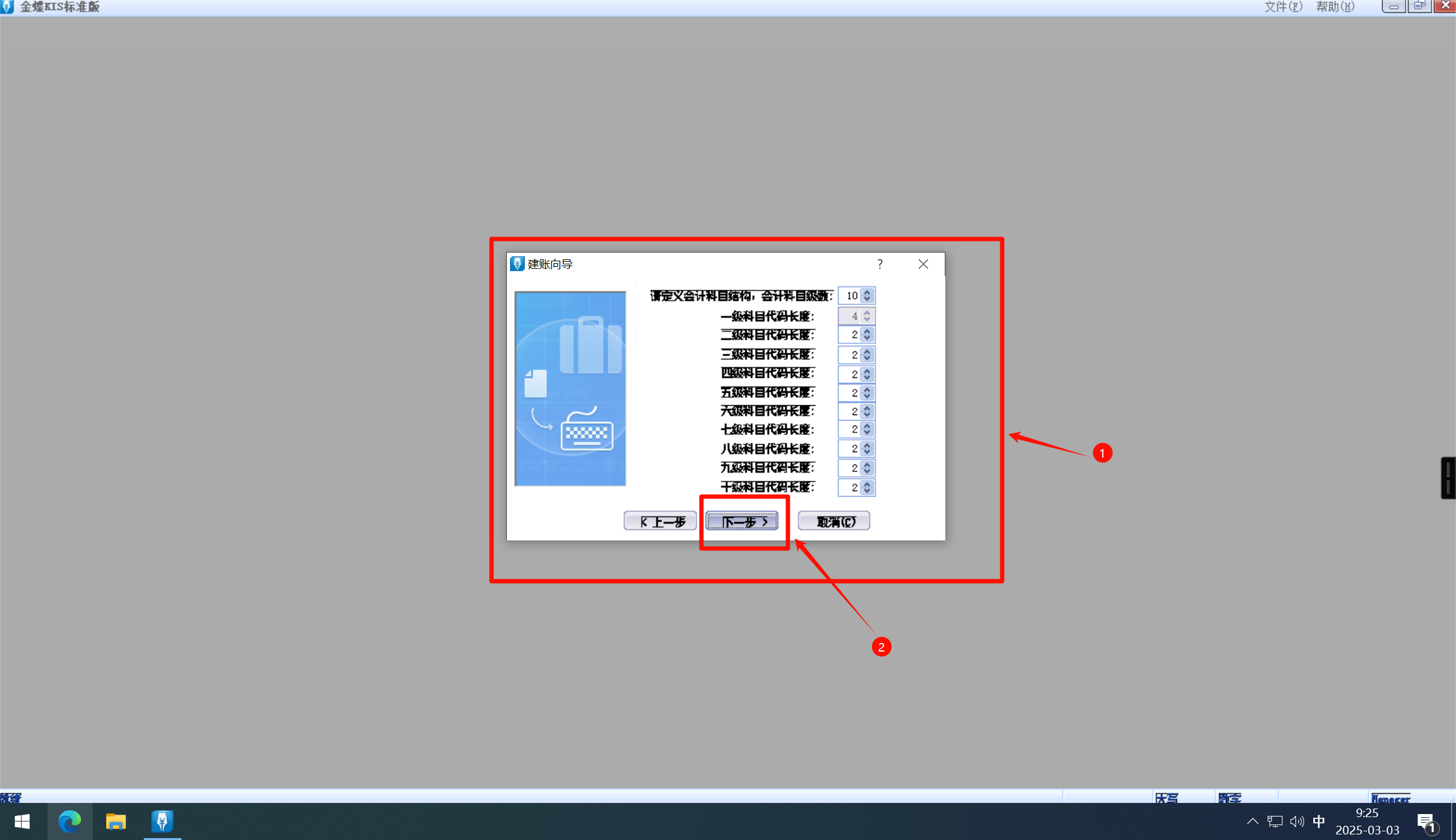 输入科目级数(就是科目代码的字符数,默认一级代码4个字符,其他级次代码2个字符)