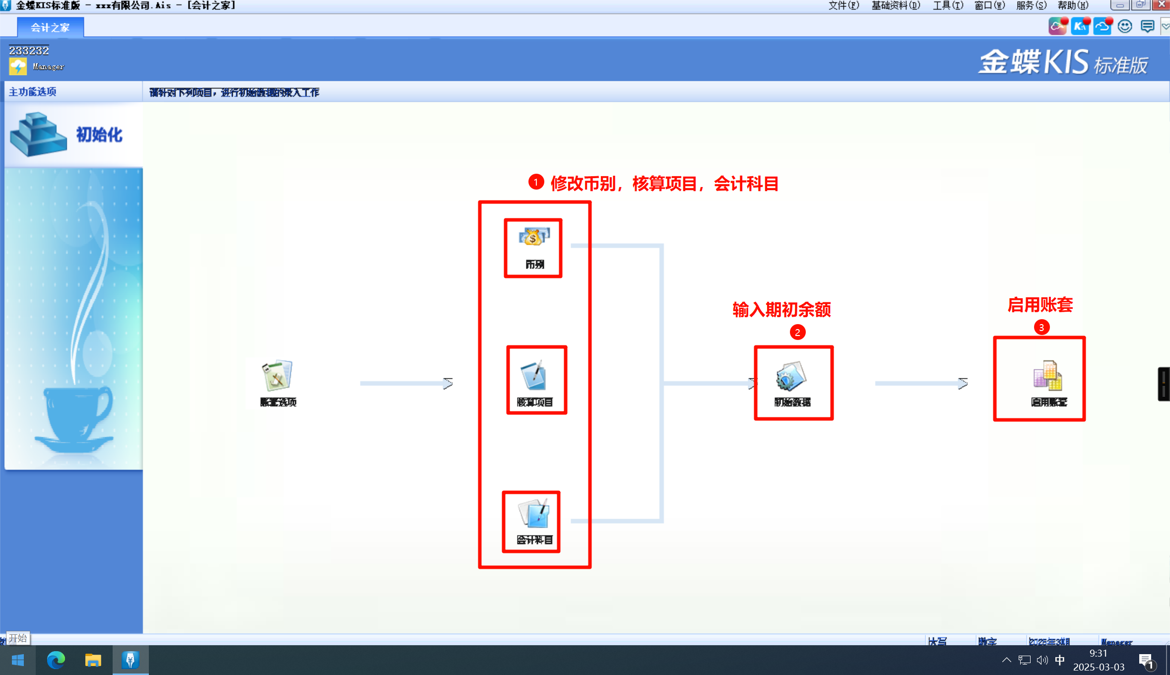 设置会计期间,启用期间(就是从什么时候开始做账,该日期以前的帐只能以初始余额的方式进入系统)