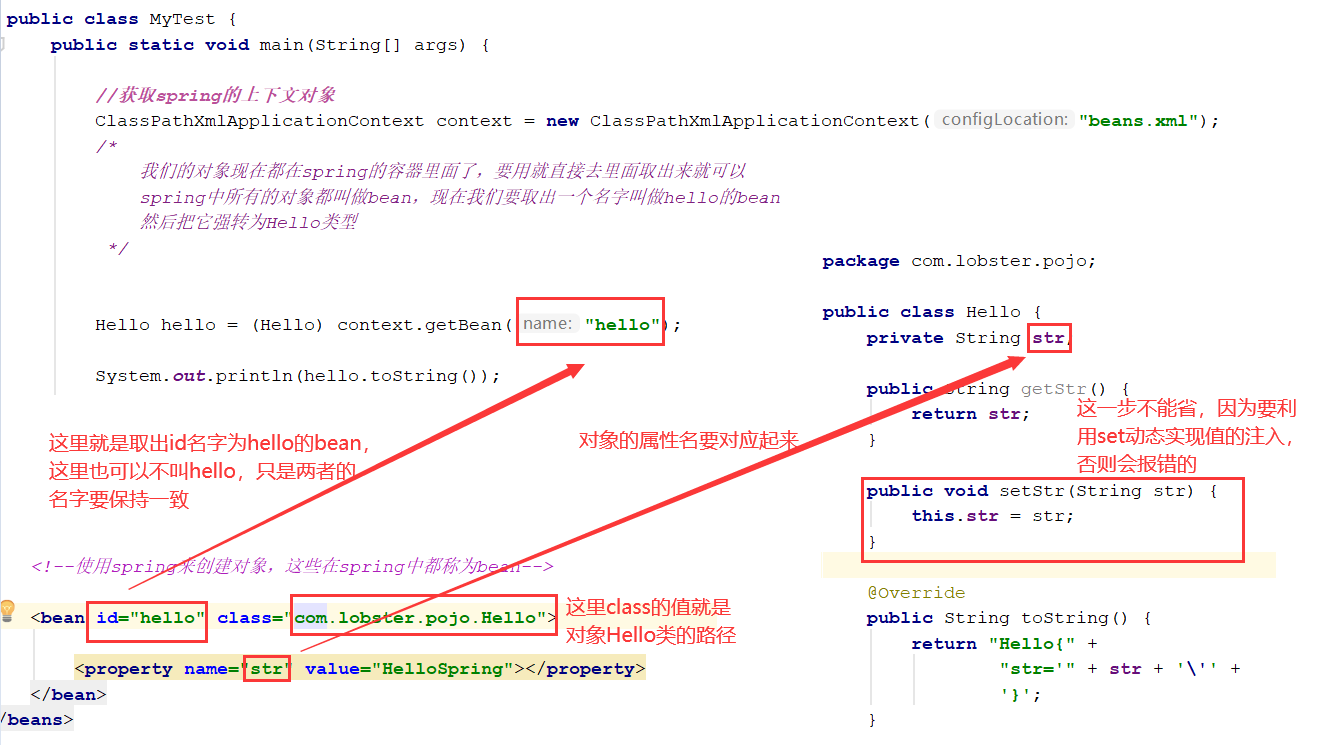 <bean id="hello" class="com.lobster.pojo.Hello">