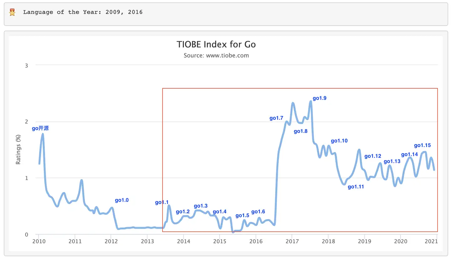 我们从知名的TIOBE编程语言指数排行榜获取Go从2009年开源以来至今的指数曲线图,并且根据Go版本发布历史在图中标记出了各个时段的Go发布版本,你可以看看。