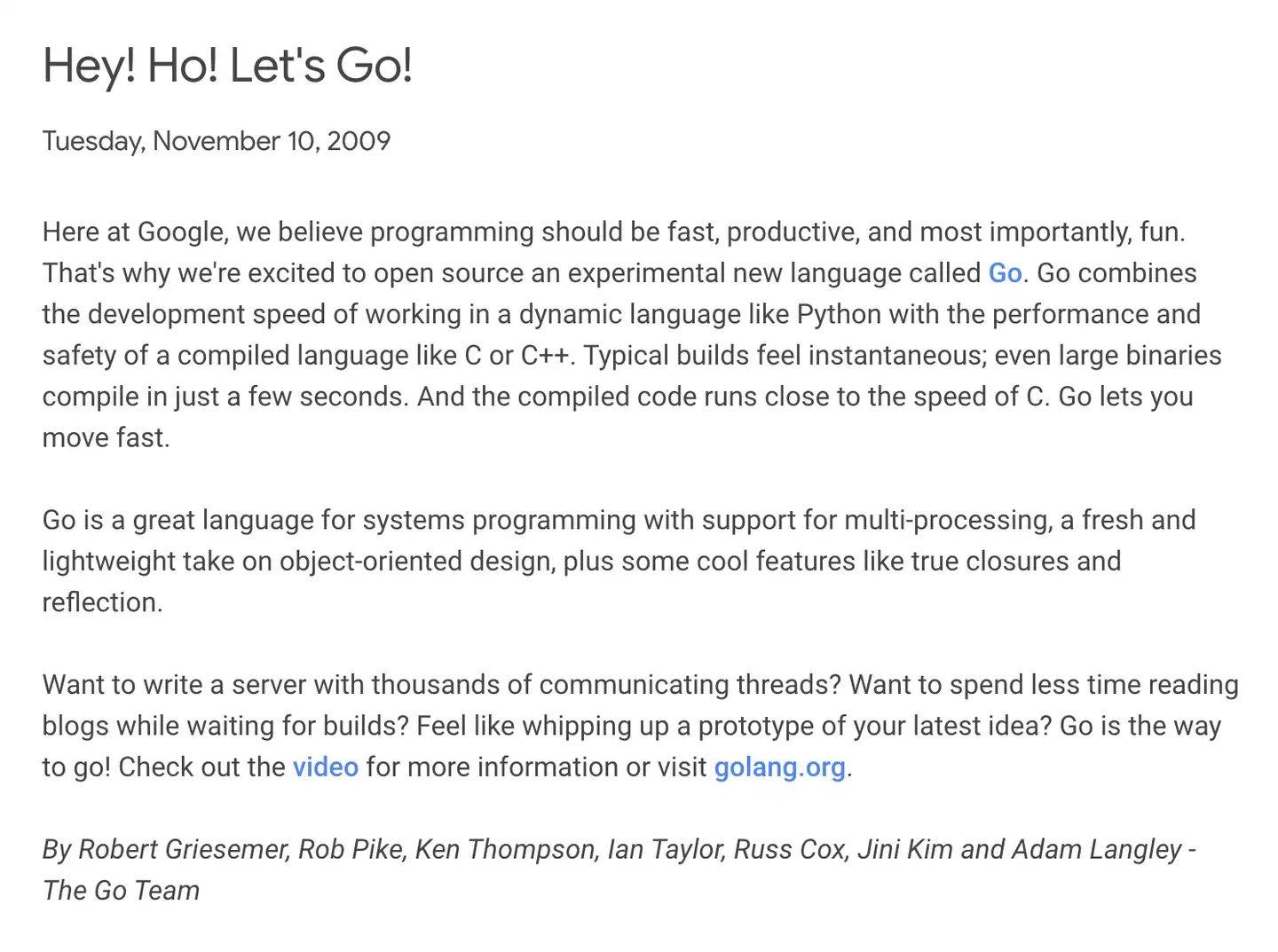 2009年10月30日,罗伯·派克在Google Techtalk上做了一次有关Go语言的演讲“The Go Programming Language”,这也是Go语言第一次公之于众。十天后,也就是2009年11月10日,谷歌官方宣布Go语言项目开源(如图1-4),之后这一天也被Go官方确定为Go语言的诞生日。