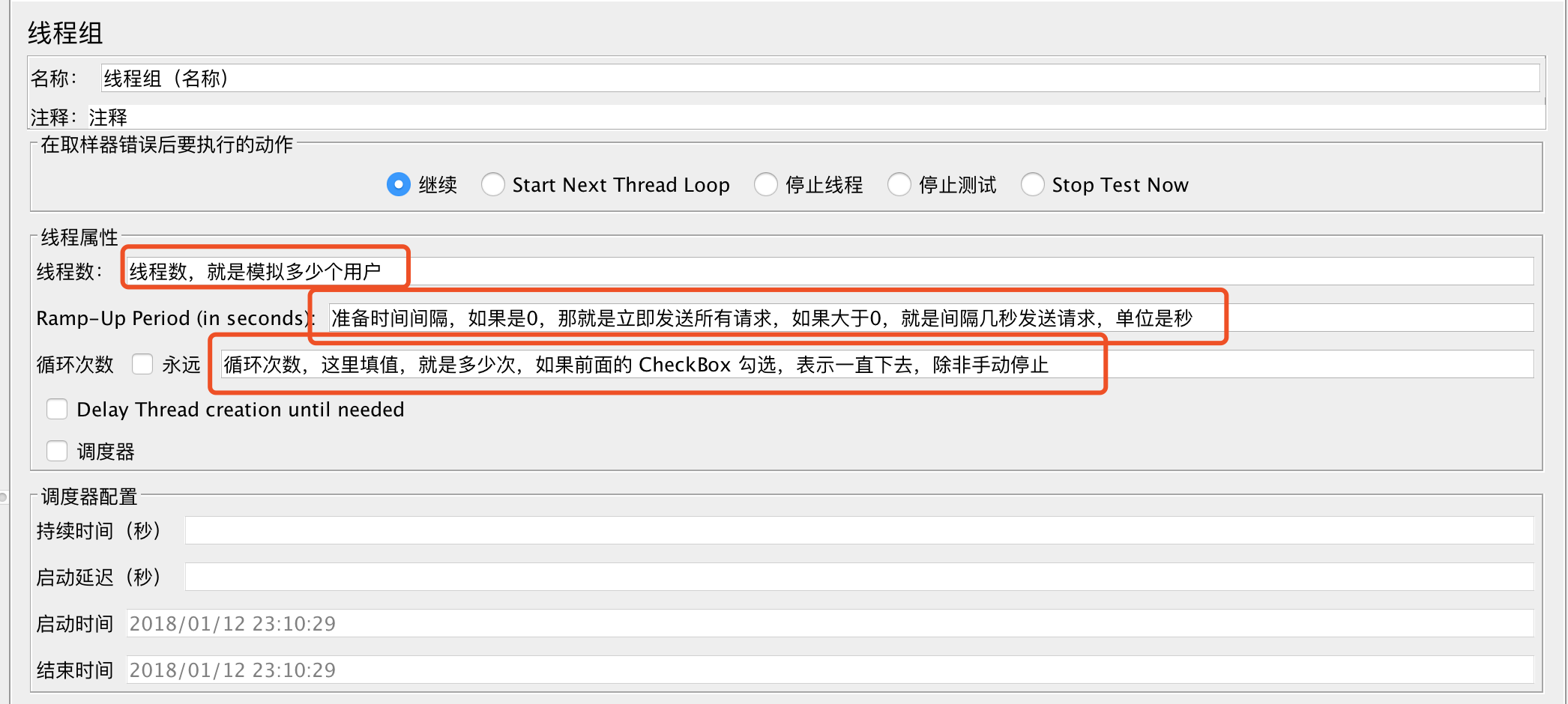 针对 JMeter 线程组做了参数的解释,你看下面对应的选项的输入框有做解释。
