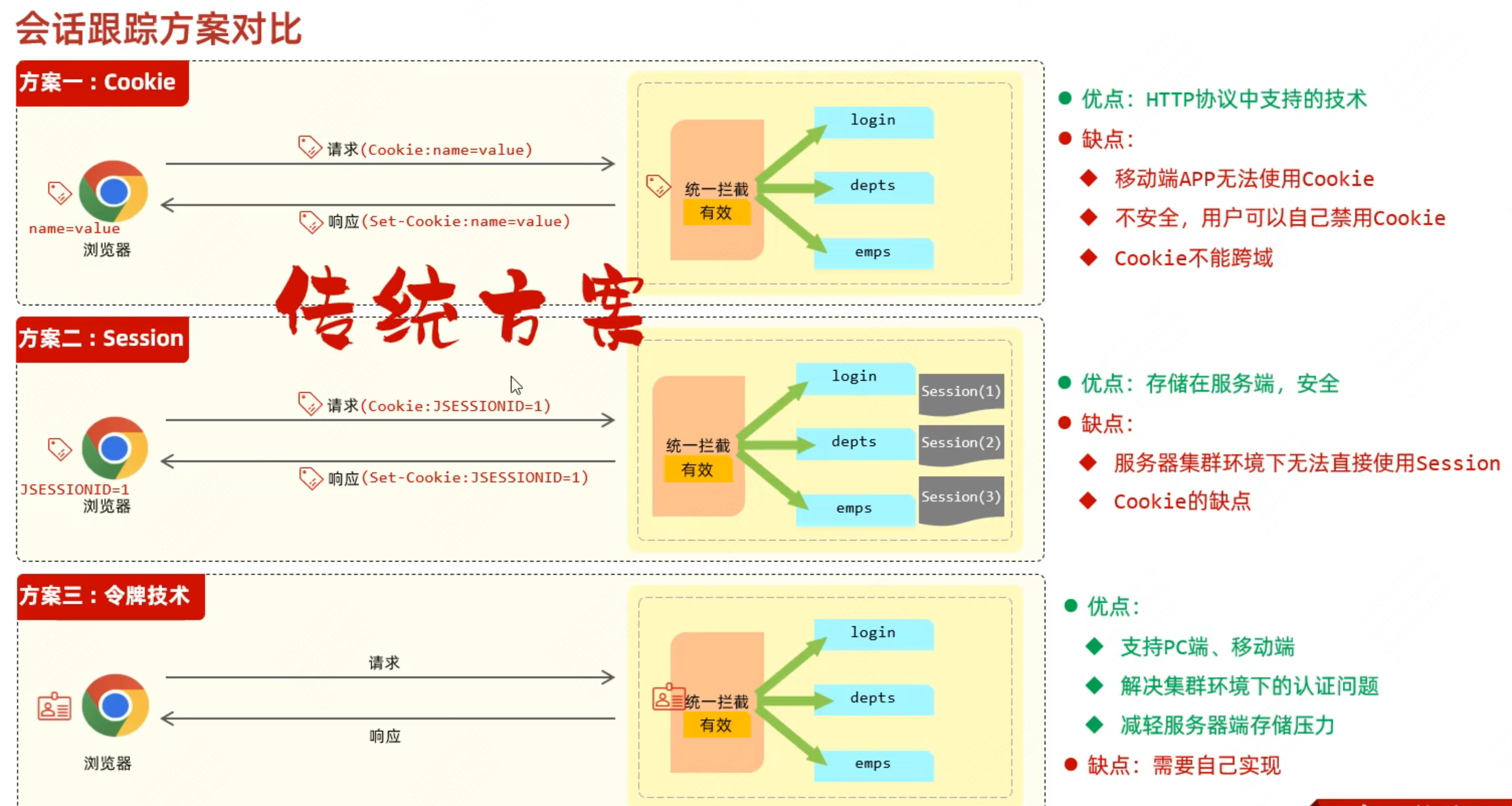 - 移动端无法使用Cookie;存储在浏览器客户端,不安全,用户可以自己禁用Cookie;Cookie不能跨域
