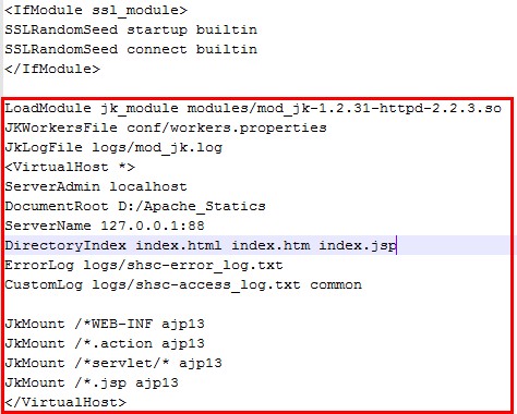 上述代码加载了 mod_jk 模块 和 workers.properties 文件,并定义了日志文件的输出位置(logs/mod_jk.log);ServerAdmin、DocumentRoot、ServerName和之前配置的相同即可;JkMount 指定了 那些路径 会通过 ajp13 协议 交给Tomcat 去处理,多个路径定义多个 JkMount ... ajp13 即可。这样以WEB-INF开头的或者以.action或.jsp结尾的或者以 servlet/ 开头的 URL 都会 交由 Tomcat 去解析。自此,Apache 与 Tomcat 整合完毕,通常情况下程序的静态资源部分部署到之前提到的D:\Apache_Statis文件夹下,而非静态资源则部署到Tomcat下。