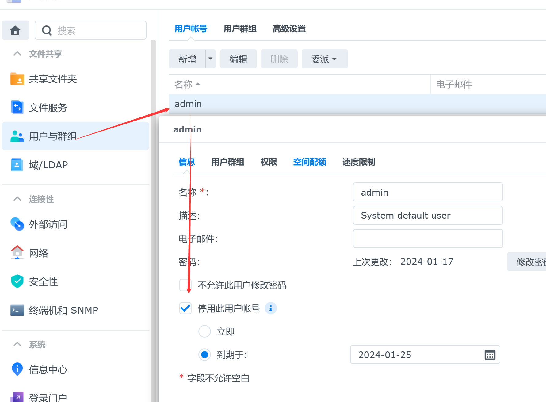用户群组---用户账号---admin --- 右击编辑 -----停用此用户账号-----到期于 随便设置几天就可以.