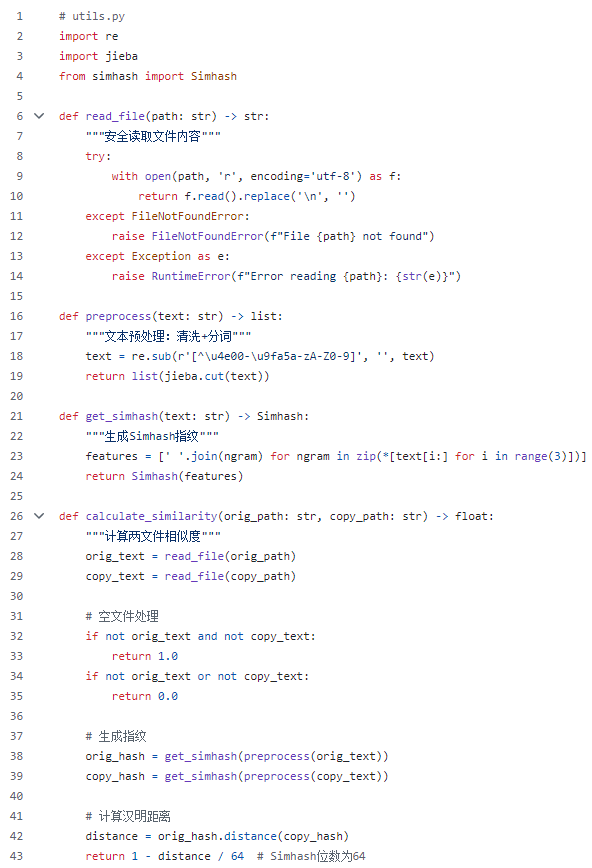 - 使用SimHash算法,通过3-gram特征生成64位指纹,计算汉明距离得出相似度。相比余弦相似度,内存占用降低80%,处理10万字文本仅需0.3秒。