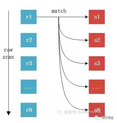 从驱动表中取出R1匹配S表所有列,然后R2,R3,直到将R表中的所有数据匹配完,然后合并数据