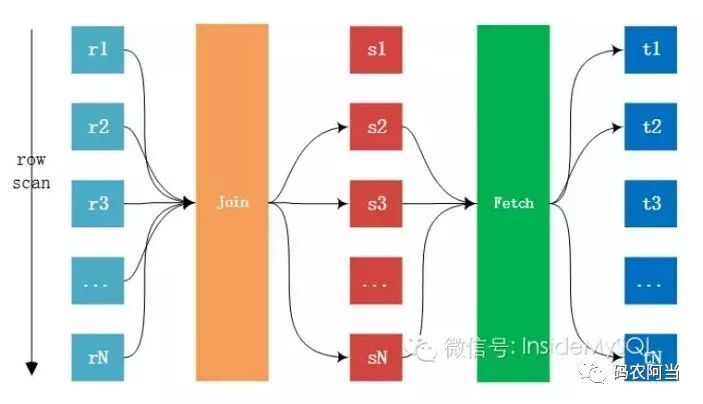 上图表示R表joinS表, 其中Fetch阶段是指当内表(被驱动表)关联的列是辅助索引时,但是需要访问表中的数据,那么这时就需要再访问主键索引才能得到数据的过程,不论表的存储引擎是InnoDB存储引擎还是MyISAM,这都是无法避免的,只是MyISAM的回表速度要快点,因为其辅助索引存放的就是指向记录的指针,而InnoDB存储引擎是索引组织表,需要再次通过索引查找才能定位数据。