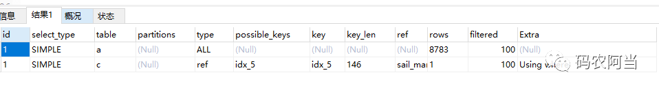 从上图可知,a表驱动c表,c表用到刚加的索引,以及ref到a表的索引,查询效率上急速提高