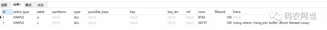 type都是ALL,即全表查询,没有用到索引,其中Extra列出现 Using join buffer (Block Nested Loop),从字面意思理解用到了缓存跟循环