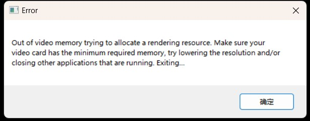 Out of video memory trying to allocate a rendering resource. Make sure your video card has the minimum required memory, try lowering the resolution and/orclosing other applications that are running. Exiting...