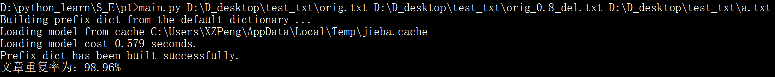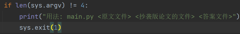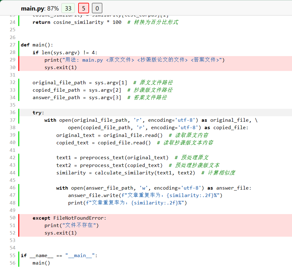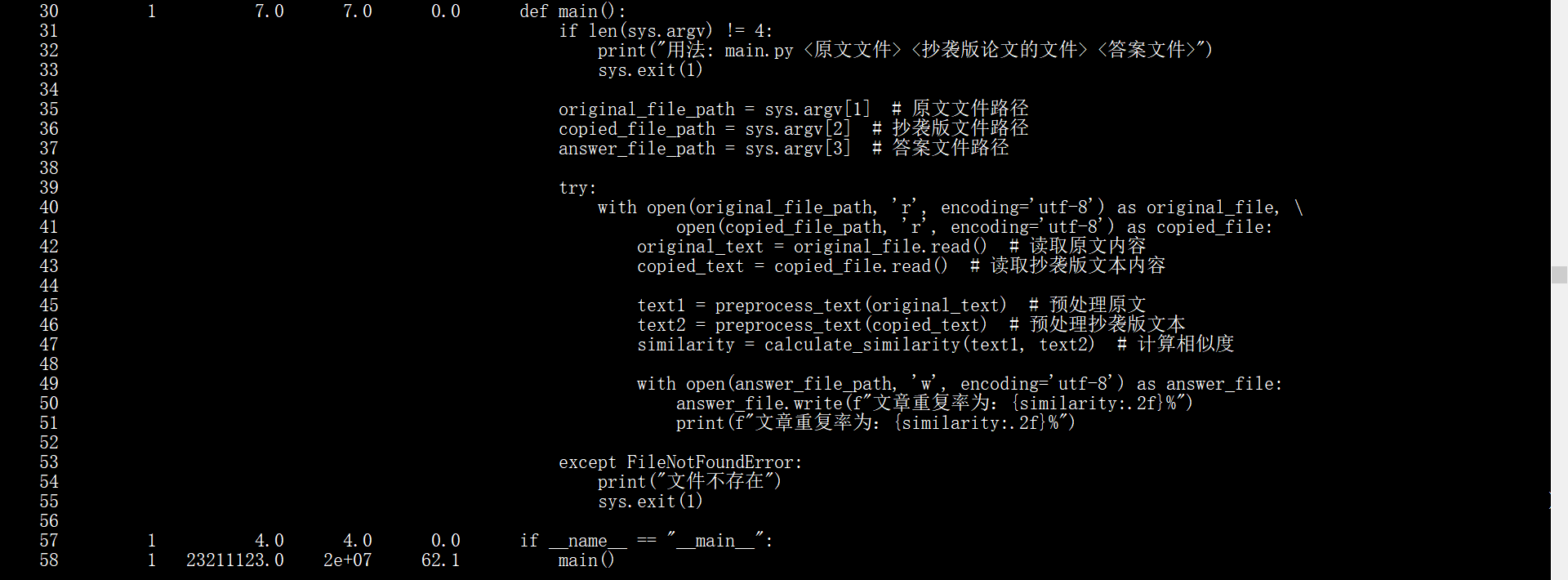 主程序在接收到命令行传来的三个文件路径后,通过文件路径,读取文件。在预处理原文和抄袭版文本,然后将两个预处理文本进行相似度计算,最后进行输出。