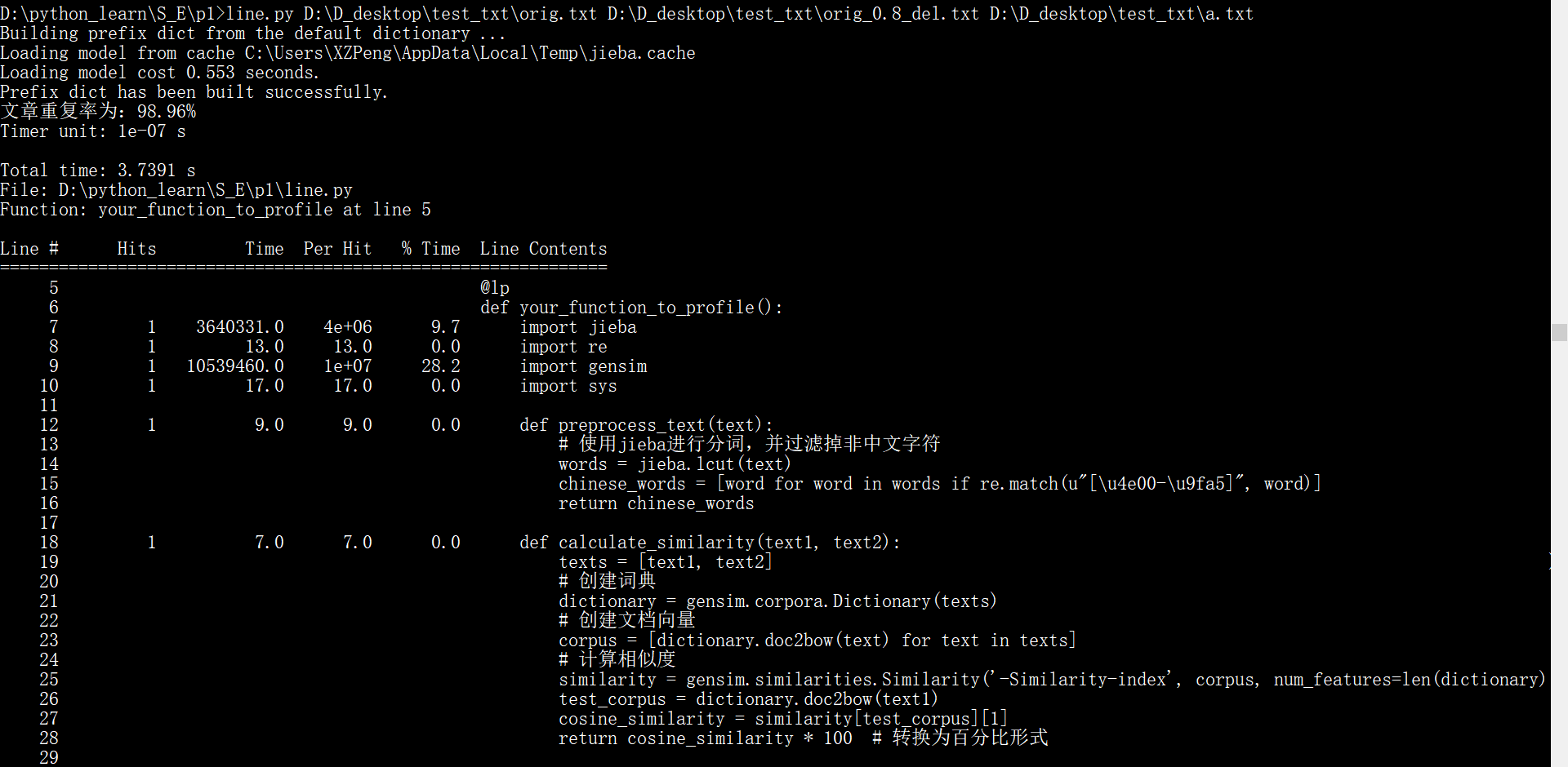 使用Line-profiler库,对程序性能进行分析,在命令行中输入参数之后运行测试程序,得到性能分析表。