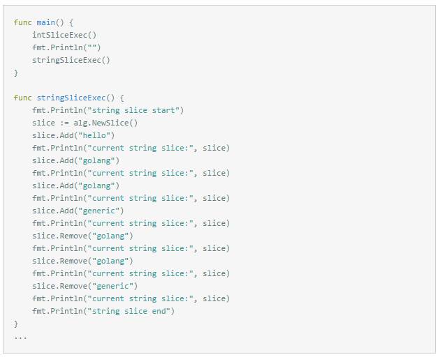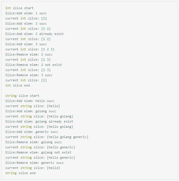 从试用代码中可以看出,字符串型数组切片中最多有三个元素[hello golang generic],元素golang插入的第二次应该失败,同理元素golang删除的第二次也应该失败,字符串型数组切片最后只剩下一个元素[hello]。