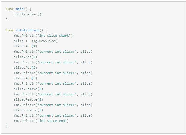 从试用代码中可以看出,整型数组切片中最多有三个元素[1 2 3],元素2插入的第二次应该失败,同理元素2删除的第二次也应该失败,整型数组切片最后只剩下一个元素[1]。