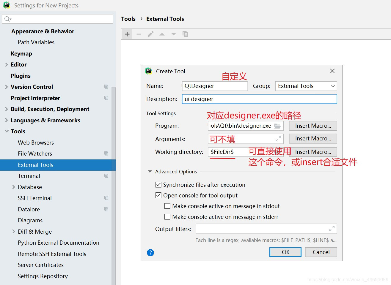 Working directory: $FileDir$ (直接复制粘贴,或点击按钮“Insert macro…” 选择对用文件)