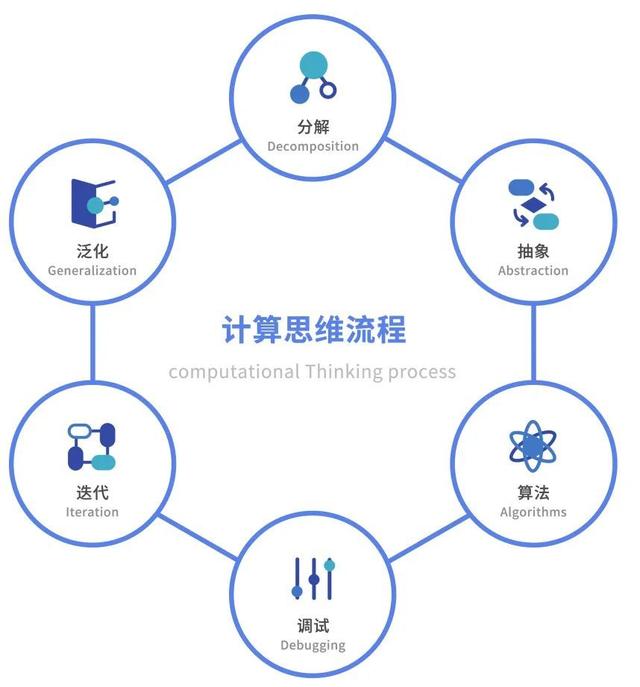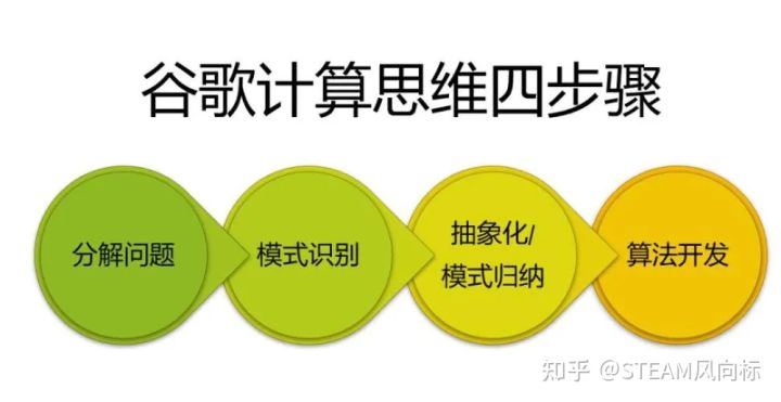 谷歌公司将计算思维概括成“分解问题、模式认知、抽象思维、算法开发”四个步骤。