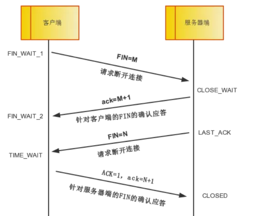 第二次分手:Server端收到了Client端发送的FIN报文段,向Client端返回一个标志位是ACK的报文段,ack设为seq加1,Client端进入FIN_WAIT_2状态,Server端告诉Client端,我确认并同意你的关闭请求。