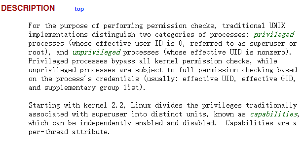kernel 2.2 之后Linux 以capabilities区分不同单元的关联root特权。非root进程都去检查对应的capabilities。