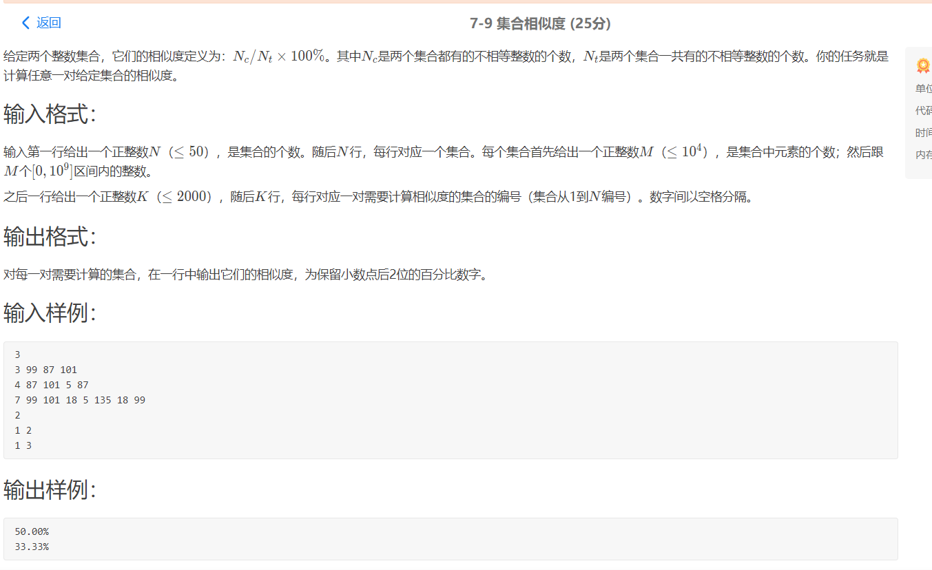 #include<iostream> using namespace std; #include<set> set<int> u[55]; double similar(int a, int b) { int same = 0; double intersection, Union; for (set<int>::iterator pos = u[a].begin(); pos != u[a].end(); pos++) { if (u[b].find(*pos) != u[b].end()) { same++; } } intersection = same; Union = u[a].size() + u[b].size() - same; return (intersection / Union) * 100; } int main(void) { int N, K,num; scanf("%d", &N); for (int i = 0; i < N; i++) { scanf("%d", &K); for (int j = 0; j < K; j++) { scanf("%d", &num); u[i].insert(num); } } int g,a,b; double result; scanf("%d", &g); for (int i = 0; i < g; i++) { scanf("%d %d", &a, &b); result = similar(a-1, b-1); printf("%.2lf%%\n", result); } }
