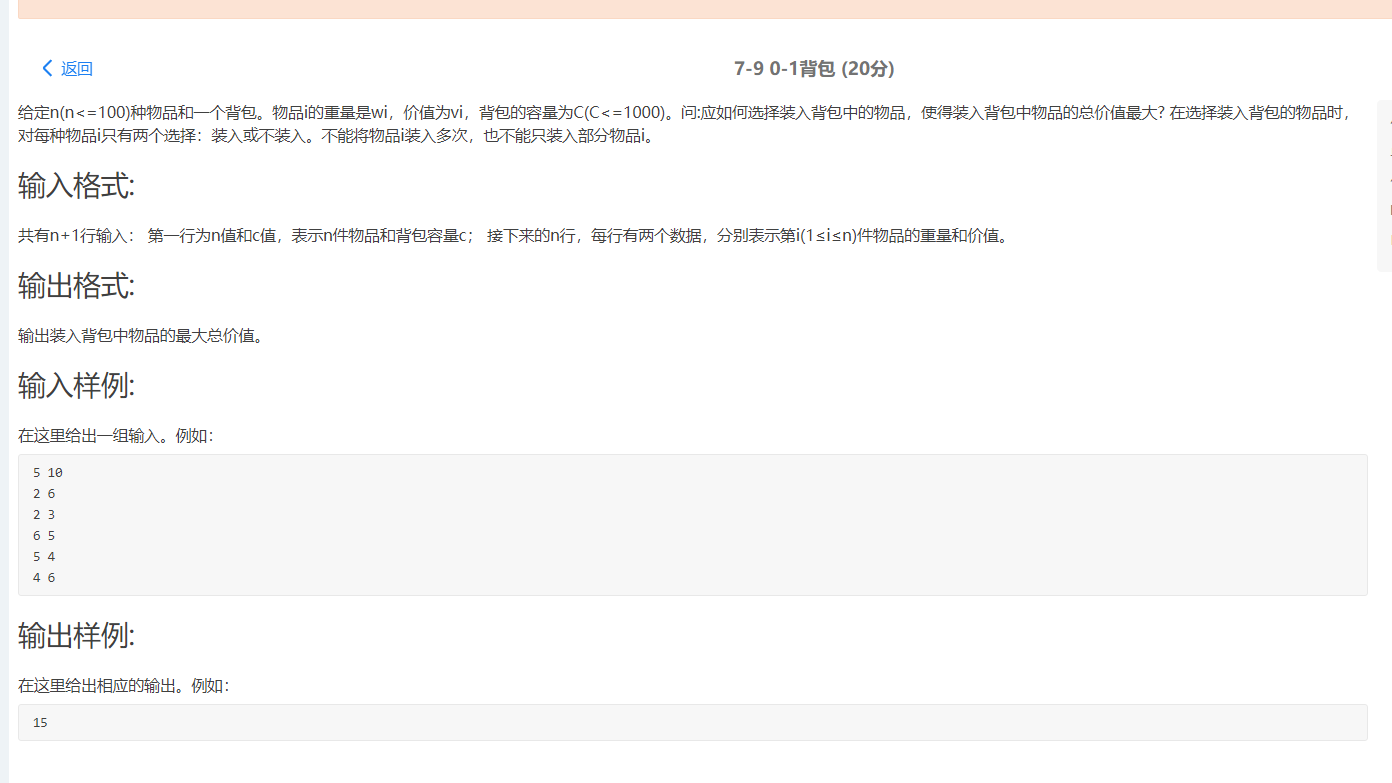 #include<stdio.h> #include<stdlib.h> #include<string.h> int max(int a,int b) { if(a>b) return a; else return b; } int main(void) { int n,c,i,j; scanf("%d %d",&n,&c); int rl[n+1][c+1]; int w[n+1],v[n+1]; memset(rl,0,sizeof(rl)); memset(w,0,sizeof(w)); memset(v,0,sizeof(v)); for(i = 1;i<=n;i++) { scanf("%d",&w[i]); scanf("%d",&v[i]); } for(i = 1;i <= n;i++) { for(j = 1;j<=c;j++) { if(j<w[i]) rl[i][j] = rl[i-1][j]; else rl[i][j] = max(rl[i-1][j],rl[i-1][j-w[i]]+v[i]); } } printf("%d",rl[n][c]); return 0; }