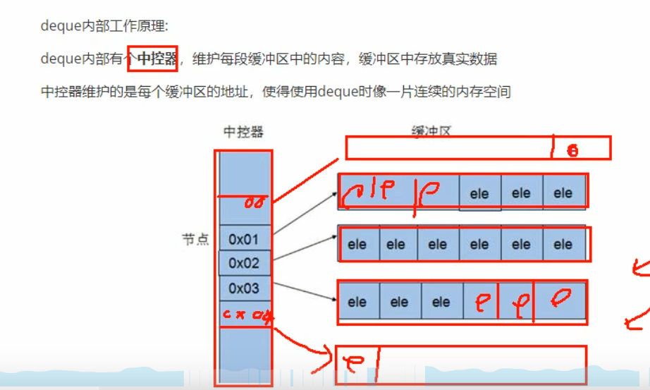 deque工作原理有点像链表,但是它是通过中控器来把各个数据连接到一块儿