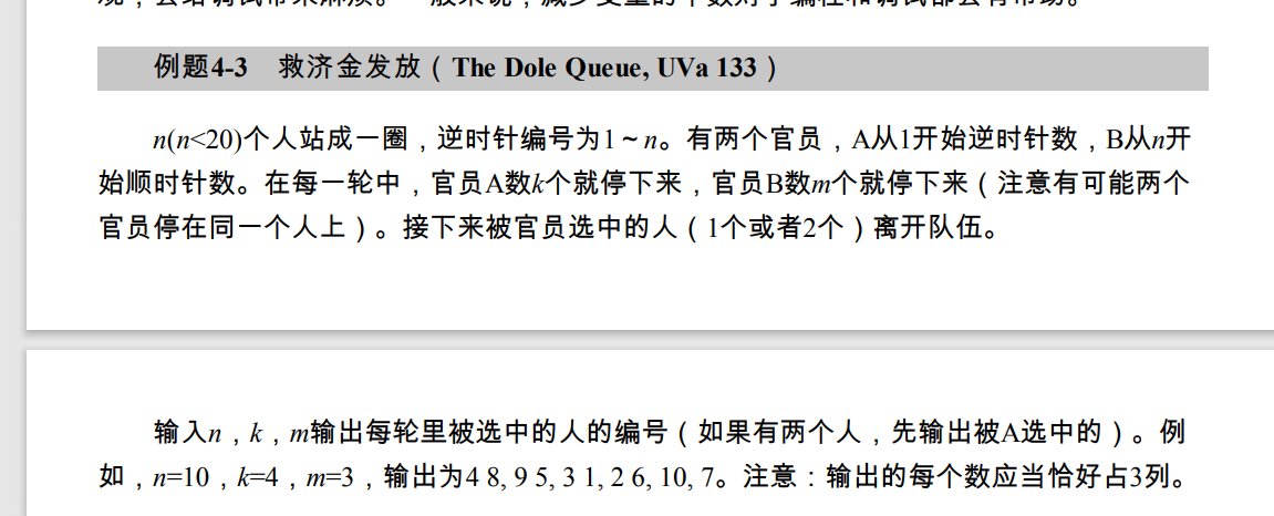 #include<stdio.h> int n, k, m, arr[25]; int select(int s, int rec, int count) { while (count--) { if(rec == 1) { //每次都要从本身开始,所以第一次循环是开始处的人,因为数组中1~10的值是1~10,所以对10取模应该从得到的数应该从得到数的上一个+1 do { s = (n + s+rec-1) % 10 + 1; } while (arr[s] == 0); } if(rec == -1) do { s = (n + s-2) % 10+1; } while (arr[s] == 0); } return s; } int main(void) { scanf("%d %d %d", &n, &k, &m); int s1, s2; s1 = n; s2 = 1; int left = n; for (int i = 1; i <= n; i++) arr[i] = i; while (left) { s1 = select(s1, 1, k); s2 = select(s2, -1, m); printf("%3d", s1); left--; if(arr[s1]!=arr[s2]) { printf("%3d", s2); left--; } arr[s1] = 0; arr[s2] = 0; if(left) printf(","); } printf("\n"); }