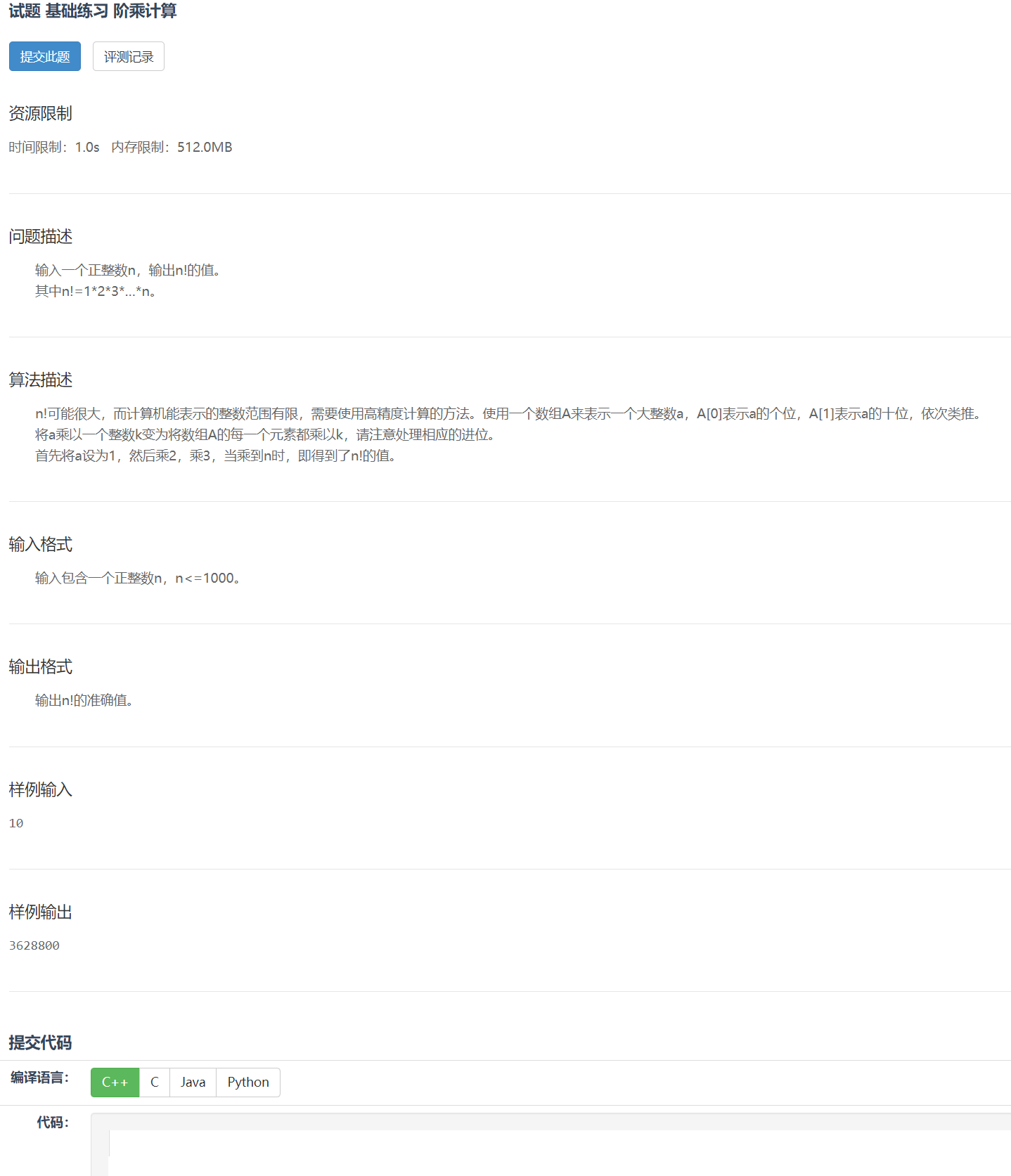 #include<stdio.h> #include<string.h> int a[10000], b[10000], c[10000]; int len_a = 0, len_b = 0, len_c = 0; int main(void) { int n; scanf("%d", &n); b[1] = 1; len_b = 1; for (int i = 1; i <= n; i++) { len_a = 1; int m = i; while (m != 0) { a[len_a++] = m % 10; m /= 10; } for (int j = 1; j <= len_a; j++) { for (int k = 1; k <= len_b; k++) { c[j + k - 1] += a[j] * b[k]; } } len_c = len_a + len_b; for (int j = 1; j <= len_c; j++) { if (c[j] > 9) { c[j + 1] += c[j] / 10; c[j] %= 10; if (j == len_c) len_c++; } } for (int j = len_c; c[len_c] == 0; j--) { len_c--; } len_b = len_c; for (int j = 1; j <= len_c; j++) b[j] = c[j]; memset(c, 0, sizeof(c)); } for (int i = len_b; i >=1; i--) { printf("%d", b[i]); } return 0; }
