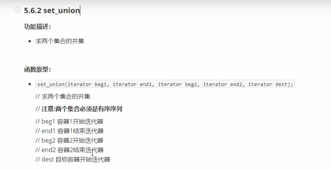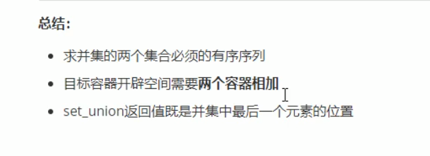 #include<iostream> using namespace std; #include<algorithm> #include<vector> void myprint(int val) { cout << val << " "; } //集合合并set_union int main(void) { vector<int> v1; vector<int>v2;//要求并集的两个容器,且两个容器需要是有序的 for (int i = 0; i < 10; i++) { v1.push_back(i); v2.push_back(i + 5); } vector<int>v3;//目标容器 v3.resize(v1.size() + v2.size());// 放置并集前需要先分配大小 vector<int>::iterator itend = set_union(v1.begin(), v1.end(), v2.begin(), v2.end(), v3.begin());//返回目标容器最后放置数的迭代器 for_each(v3.begin(), itend, myprint); cout << endl; return 0; }
