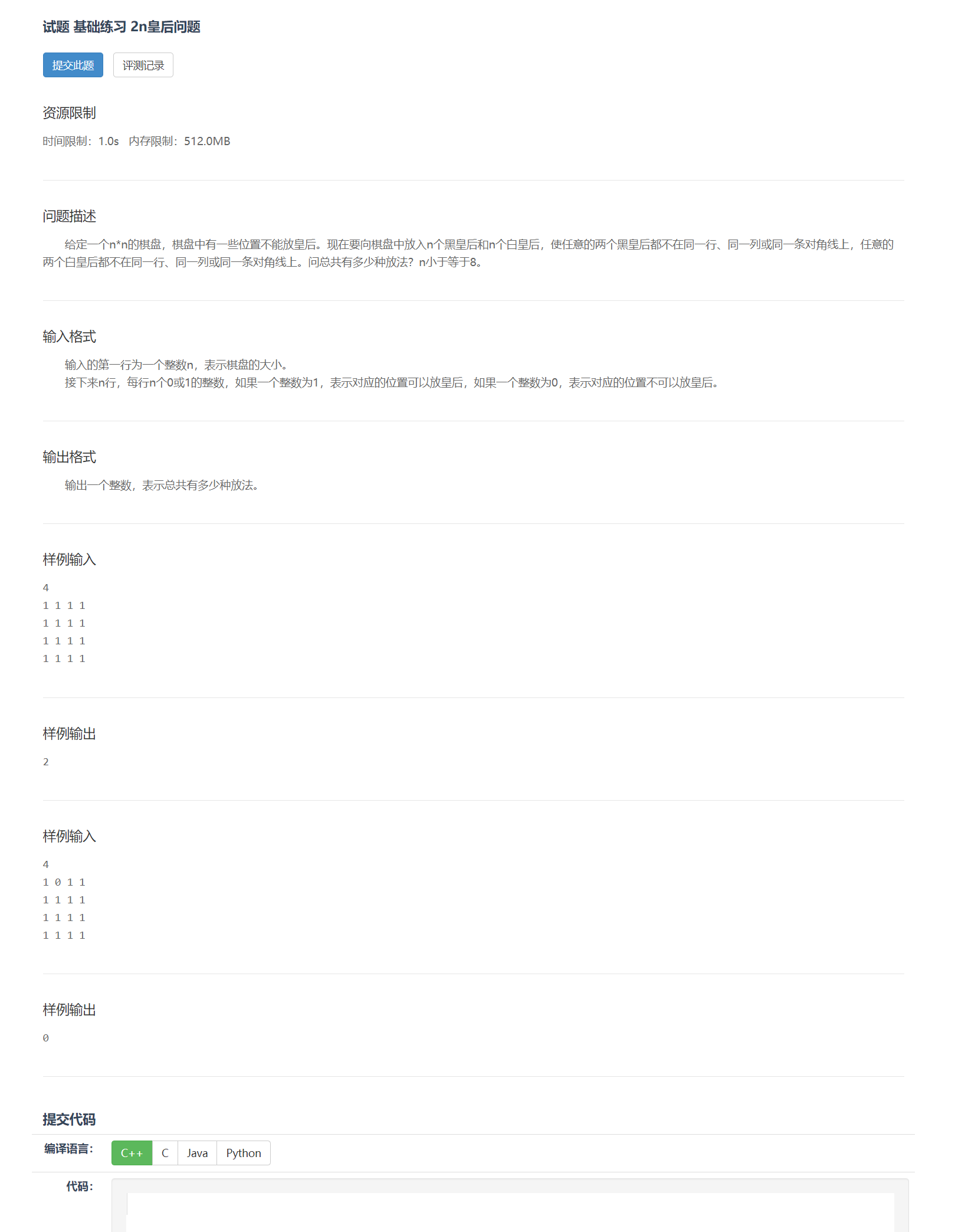 #include<stdio.h> #include<string.h> #include<stdlib.h> #include<math.h> int queue[10]; int queueB[10]; int sum = 0; int table[10][10]; //用于测试第一种皇后的代码 void show(int n) { for (int i = 0; i < n; i++) { for (int j = 0; j < n; j++) { if (queue[i] == j) printf("M "); else printf("* "); } printf("\n"); } } //用于测试第二种皇后的代码 void showB(int n) { for (int i = 0; i < n; i++) { for (int j = 0; j < n; j++) { if (queue[i] == j) printf("M "); else printf("* "); } printf("\n"); } } //判断该位置能否放置第一种皇后 int check(int h) { for (int i = 0; i < h; i++) { if (queue[i] == queue[h] || abs(queue[i] - queue[h]) == abs(i - h)) return 0; } return 1; } //判断该位置能否放置第二种皇后 int checkB(int h) { for (int i = 0; i < h; i++) { if (queueB[i] == queueB[h] || abs(queueB[i] - queueB[h]) == abs(i - h)) return 0; } return 1; } //枚举寻找第二种皇后符合题意的方法 void queue_eightB(int a, int b) { if (a < b) { for (int i = 0; i < b; i++) { if (table[a][i] == 1 && queue[a] != i) { queueB[a] = i; if(checkB(a)) queue_eightB(a + 1, b); } } } else { sum++; //show(b); //printf("@@@\n"); //showB(b); //printf("----------------"); //printf("\n\n"); } } //枚举寻找第一种皇后的放置方法 void queue_eight(int m,int n) { if (m < n) { for (int i = 0; i < n; i++) { if (table[m][i] == 1) { queue[m] = i; if (check(m)) queue_eight(m + 1,n); } } } else queue_eightB(0, n); } int main(void) { int n; scanf("%d", &n); for (int i = 0; i < n; i++) for (int j = 0; j < n; j++) scanf("%d", &table[i][j]); queue_eight(0,n); printf("%d", sum); }