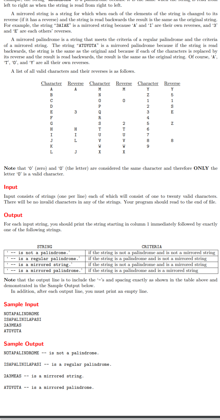 #include<stdio.h> #include<string.h> #include<ctype.h> char rev[] = { "A 3 HIL JM O 2TUVWXY51SE Z 8 " };//每一个字符的镜像字符放在一个数组中,每个字符减去A得到下标,这个数组的下标就是该字符的镜像字符 char sim(char c) //求出镜像数并返回 { if (isalpha(c))return rev[c - 'A']; else return rev[c - '0' + 25]; } int main(void) { const char* msg[] = { "is not a palindrome.","is a regular palindrome.","is a mirrored string.","is a mirrored palindrome." };//需要用const,因为数组中存放的都是指针,给出的字符串是const char*类型所以需要const char ch[999]; while (scanf("%s", ch) == 1) { int q = 1, w = 1;//用于判断是否为回文数和镜像数 int len = strlen(ch); int i; for (i = 0; i < (len + 1) / 2; i++) { if (ch[i] != ch[len - 1 - i]) q = 0;//判断前后字符是否一致 if (sim(ch[i]) != ch[len - 1 - i]) w = 0;//判断前面的镜像字符是否和后面字符一样 } printf("%s -- %s\n\n", ch, msg[w * 2 + q]); } return 0; }