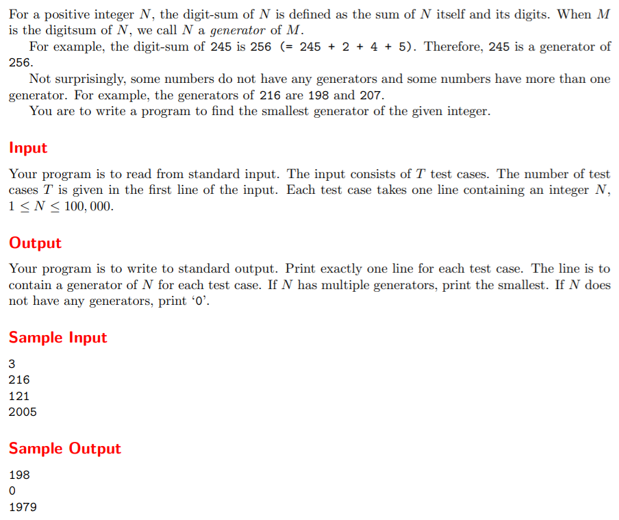 #include<stdio.h> #include<string.h> int a[100050]; int main(void) { int i,T,j; memset(a, 0, sizeof(a)); for (i = 0; i < 100005; i++) { int m = i; int sum = i; while (m) { sum += m % 10; m /= 10; } if(a[sum] == 0||i<a[sum]) a[sum] = i; } scanf("%d", &T); for (j = 0; j < T; j++) { int h; scanf("%d", &h); printf("%d\n", a[h]); } return 0; }