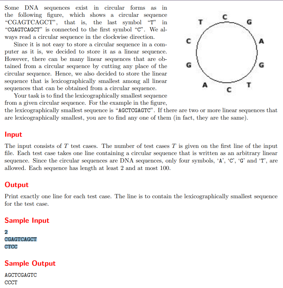 #include<stdio.h> #include<string.h> //判断两个典序的大小 int judge(char ch[], int ans, int p) { int i; for (i = 0; i < strlen(ch); i++) //比较两个序列是可以让序列成环状循环,太牛逼了 { if (ch[(ans + i) % strlen(ch)] != ch[(p + i) % strlen(ch)]) return ch[(ans + i) % strlen(ch)] > ch[(p + i) % strlen(ch)]; } return 0; } int main(void) { int T; scanf("%d", &T); char ch[101]; while (T--) { scanf("%s", ch); int ans = 0; int i; for (i = 1; i < strlen(ch); i++) { if (judge(ch,ans,i)) ans = i;//如果从i开始的序列比从ans的序列小那么ans = i } for (i = 0; i < strlen(ch); i++) { putchar(ch[(ans + i) % strlen(ch)]); } putchar('\n'); } return 0; }